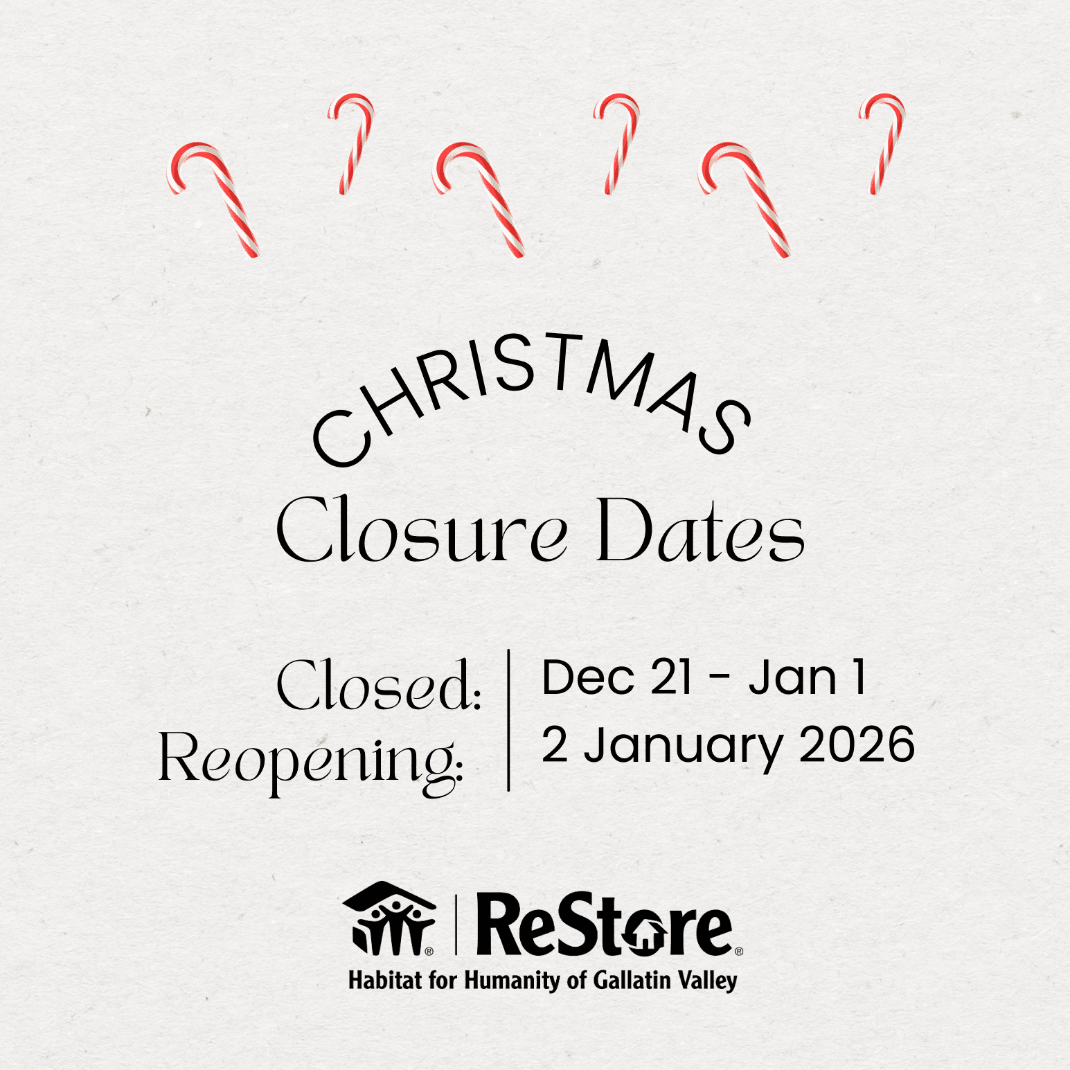 **Our next scheduled day(s) with modified hours are for Christmas. The ReStore will be closed December 21st - January 1st. The Office will be closed December 24th - December 28th, and then closed again on December 31st - January 1st.